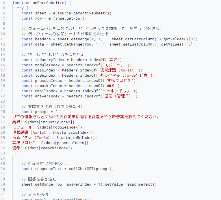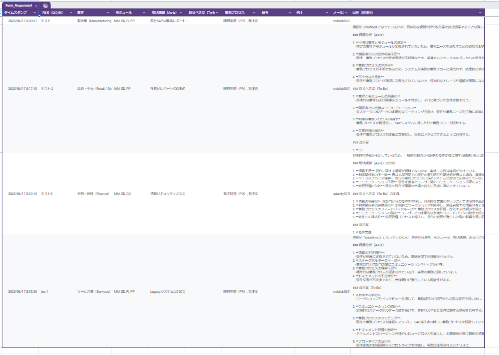 Googleフォームに入力された業務内容をもとに、ChatGPTが理想的なTo-Be業務や改善案をスプレッドシートに自動生成